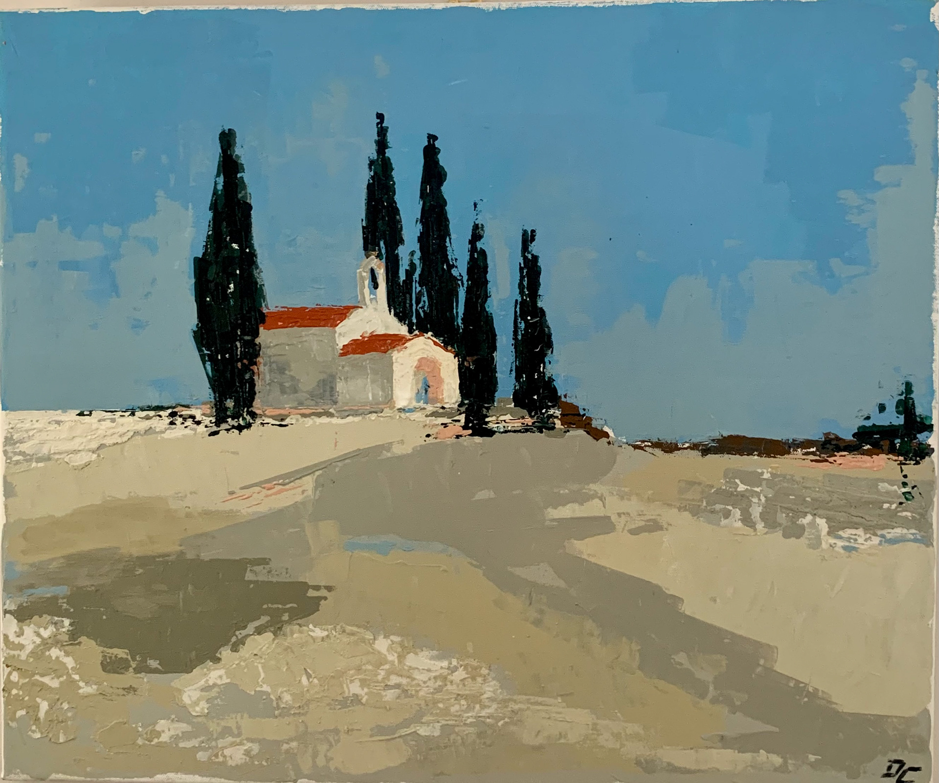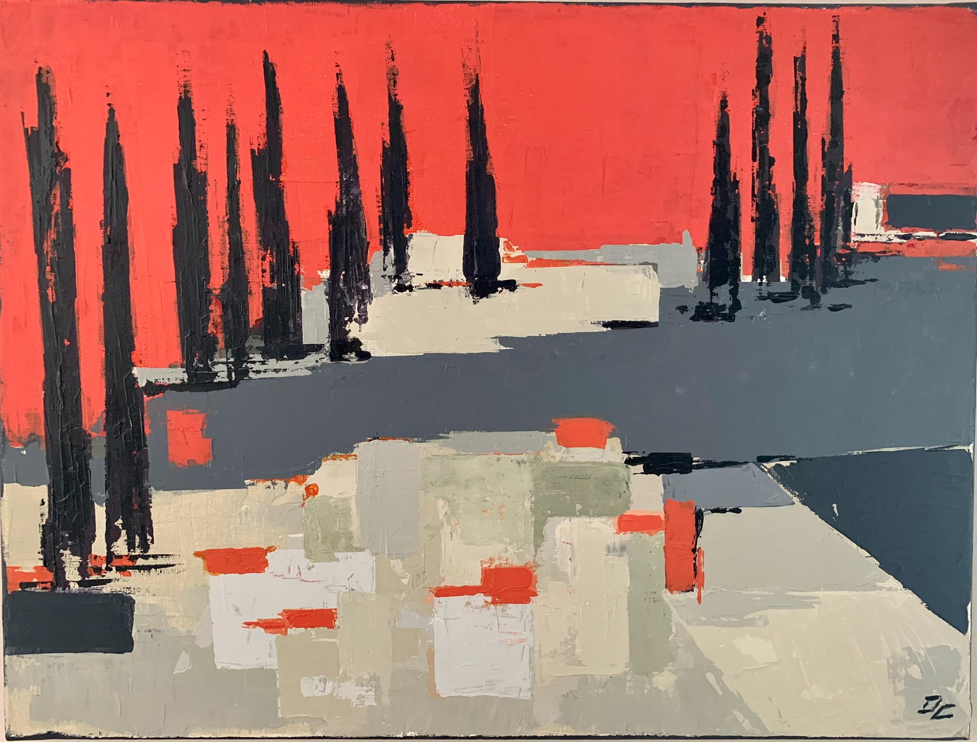 Pourtant parfois le bleu du ciel vire au rouge incandescent. Illusion d'un paysage surchauffé, les cyprès élancent leurs cimes noires vers un "Ciel empourpré".